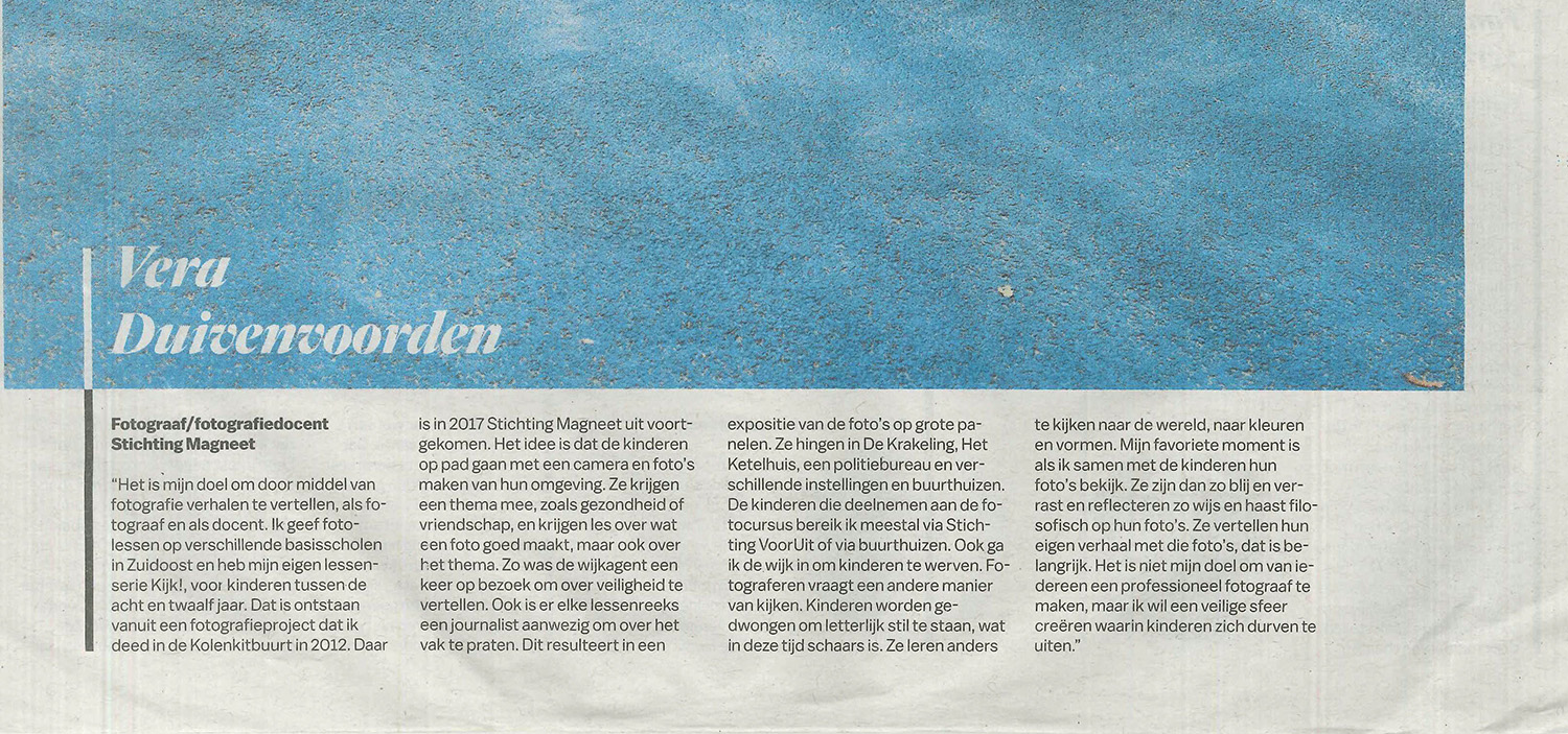 “Het is mijn doel om door middel van fotografie verhalen te vertellen, als fotograaf en als docent. Ik geef fotografielessen op verschillende basisscholen in Zuidoost en heb mijn eigen lessenserie Kijk!, voor kinderen tussen de acht en twaalf jaar. Dat is ontstaan vanuit een fotografieproject dat ik deed in de Kolenkitbuurt in 2021. Daar is in 2017 Stichting Magneet uit voortgekomen. Het idee is dat de kinderen op pad gaan met een camera en foto’s maken van hun omgeving. Ze krijgen een thema mee, zoals gezondheid of vriendschap, en krijgen les over wat een foto goed maakt, maar ook over het thema. Zo was de wijkagent een keer op bezoek om over veiligheid te vertellen. Ook is er elke lessenreeks een journalist aanwezig om over het vak te praten. “Dit resulteert in een expositie van foto’s op grote panelen. Ze hingen in De Krakeling, Het Ketelhuis, een politibureau en verschillende instellingen en buurthuizen. De kinderen die deelnemen aan de fotografiecursus bereik ik via Stichting VoorUit of via buurthuizen. Ook ga ik de wijk in om kinderen te werven. Fotograferen vraagt een andere manier van kijken. Kinderen worden gedwongen om letterlijk stil te staan, wat in deze tijd schaars is. Ze leren anders te kijken naar de wereld, naar kleuren en vormen. Mijn favoriete moment is als ik samen met de kinderen hun foto’s bekijk. Ze zijn dan zo blij en verrast en reflecteren zo wijs en haast filosofisch op hun foto’s. Ze vertellen hun eigen verhaal met die foto’s, dat is belangrijk. Het is niet mijn doel om van iedereen een professioneel fotograaf te maken, maar ik wil een veilige sfeer creëren waarin kinderen zich durven te uiten.”